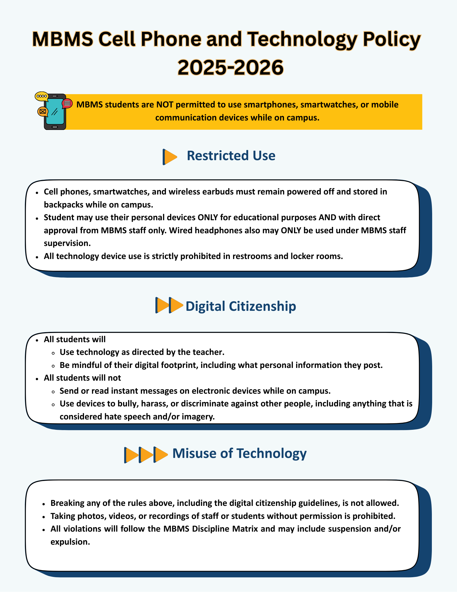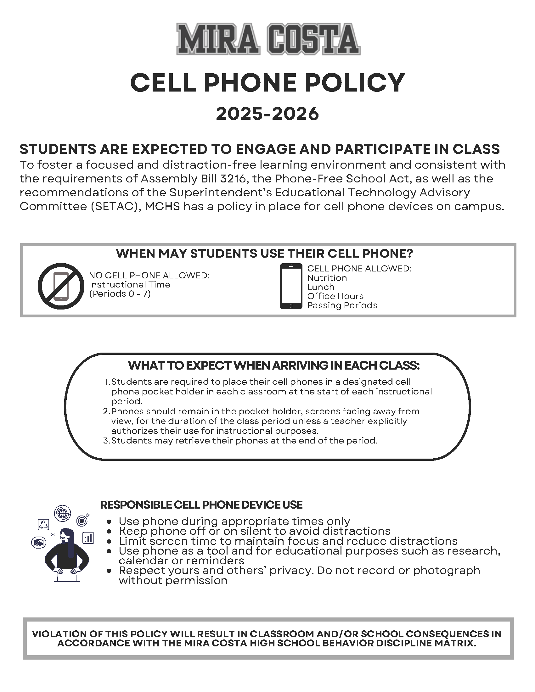 MBUSD is committed to fostering a learning environment where students are engaged and learning in an environment free from distractions. To support this goal, MBMS has introduced a one-page guide covering cell phone and technology use on campus, while Mira Costa’s one-page guide focuses on cell phones. They clearly outline expectations for student use of cell phones and other personal electronic devices during the school day.